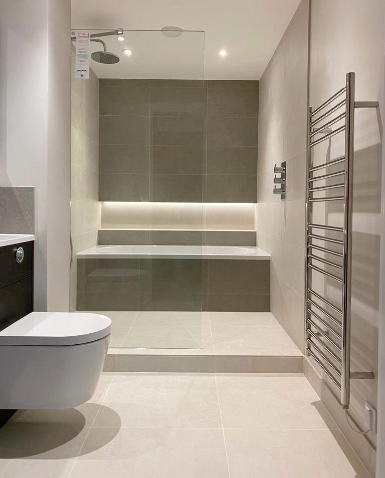 Originally there was only a bath in the room, by pushing it to the back of the room we created space for a walk-in shower. The valves on the right control both shower and bath, this kept costs down and gave the room a minimalistic and sleeker look.