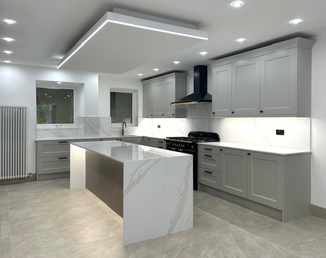 The worktop selection was crucial to the kitchen’s transformation. We chose Calacatta Gold in both 20mm and 30mm thicknesses to provide a luxurious, durable surface that would stand the test of time. The elegant veining of the Calacatta Gold added a touch of sophistication to the kitchen.